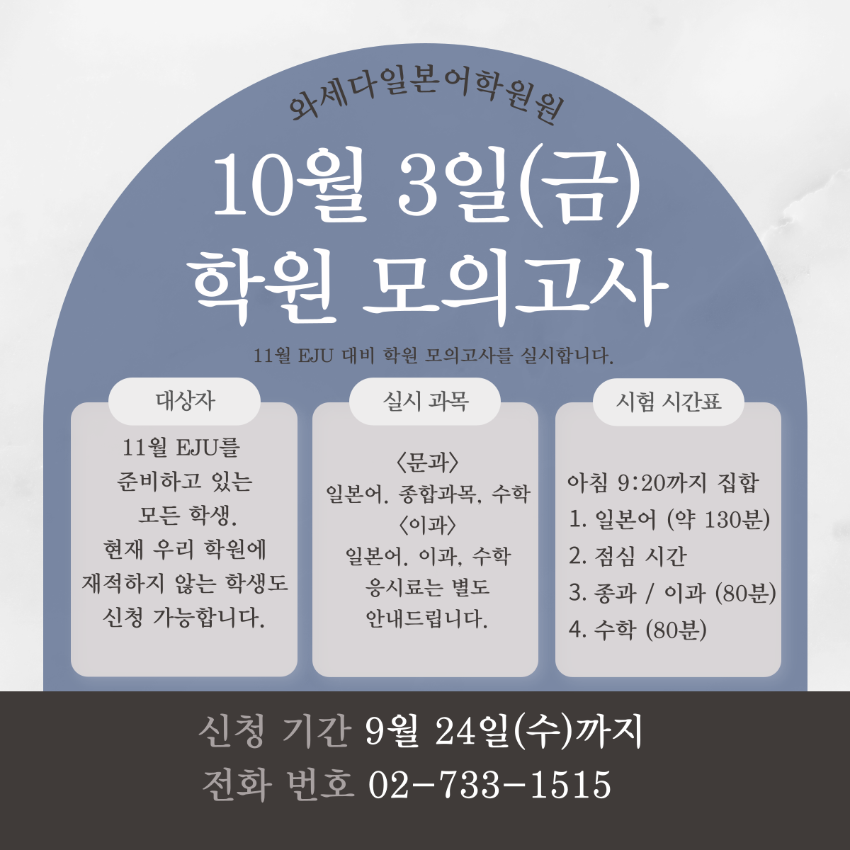 ¾È³çÇϼ¼¿ä, ¿Í¼¼´ÙÀϺ»¾îÇпøÀÔ´Ï´Ù. ´Ù°¡¿À´Â 10¿ù 3ÀÏ(±Ý) °³ÃµÀý, Çпø¿¡¼ ¸ðÀǰí»ç¸¦ ½Ç½ÃÇÕ´Ï´Ù. ½ÃÇè ´çÀÏÀÇ ½Ã°£ ¹èºÐ °¨°¢À» ÀÍÈ÷°Å³ª, ¸¶Áö¸· Á¡°ËÀÇ Àǹ̷ΠÀÀ½ÃÇØ º¸½Ã´Â °Íµµ ÁÁÀº Áغñ°¡ µÉ °ÍÀÔ´Ï´Ù. ÇöÀç ÀúÈñ Çпø¿¡ ´Ù´ÏÁö ¾Ê´Â Çлýµµ ½Åû °¡´ÉÇÏ¿À´Ï, °ü½É ÀÖ´Â ºÐµéÀÇ ¸¹Àº ½Åû ±â´Ù¸®°í ÀÖ°Ú½À´Ï´Ù. 02-733-1515 ·Î ¿¬¶ôÁÖ¼¼¿ä ^^ ![]() |